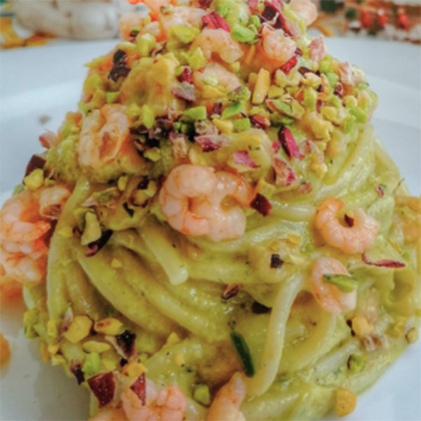 Troccoli aux Crevettes et Pesto de Pistache avec Vermentino